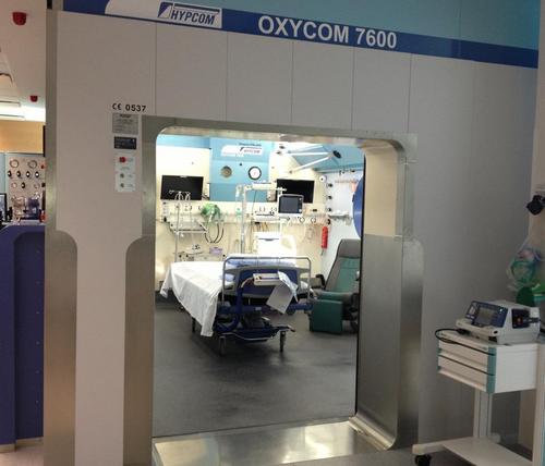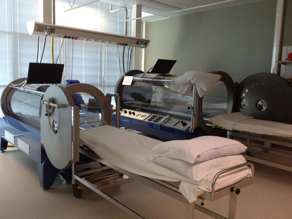 Kuvassa näkyvät TYKSin yksipaikkaiset ylipainekammiot sekä monipaikkainen, jossa voi hoitaa myös tehohoitoa vaativia potilaita.